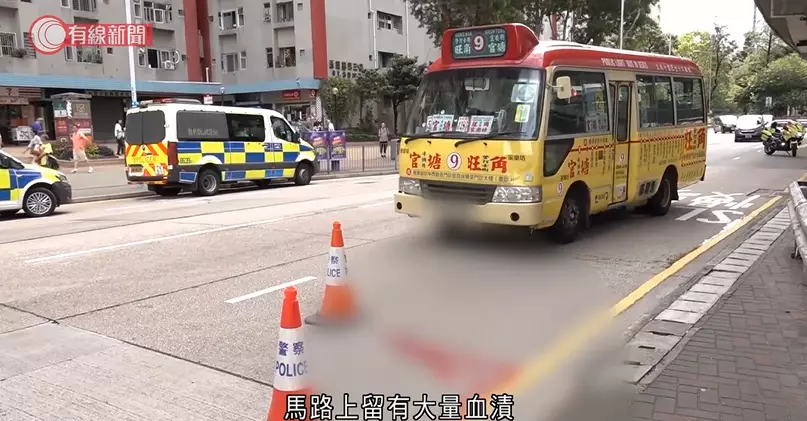 現場所見,小巴車頭被撞到凹陷,地上留有一灘血跡,涉事小巴司機被警員帶上警車調查,車上有女乘客目睹意外,亦在場協助調查。