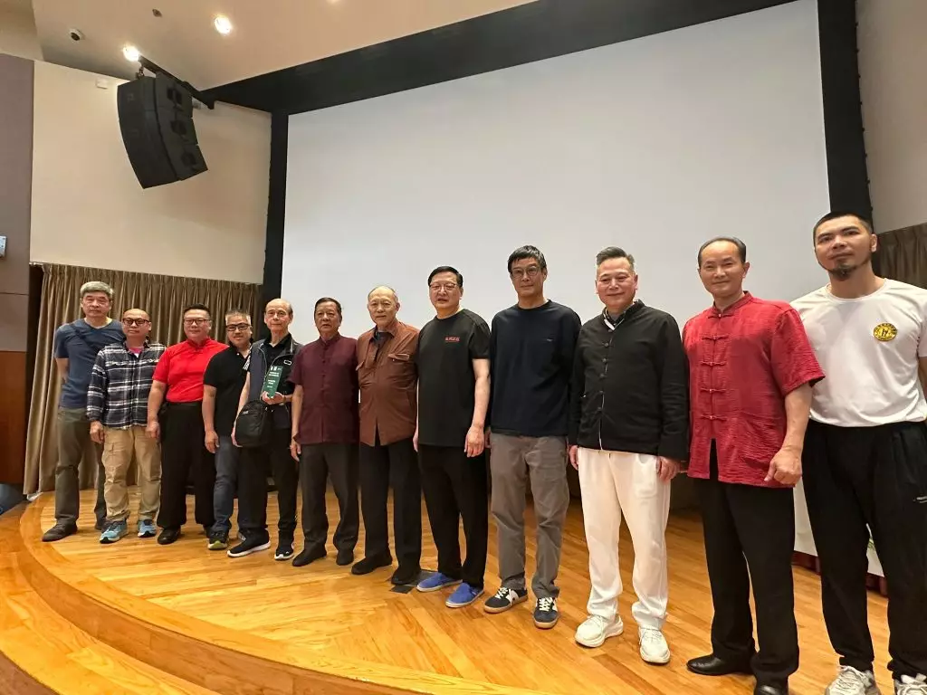 佛山詠春武術盛典暨文化傳承體驗日,多位不同流派傳人都有到場,並即席示範詠春技法。(右起)陳啟棠、羅德志、馮炯雄、車建初、張勇、霍震寰;左三:葉建斌。巴士的報記者攝