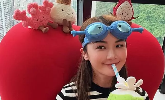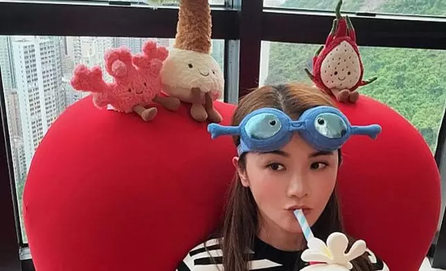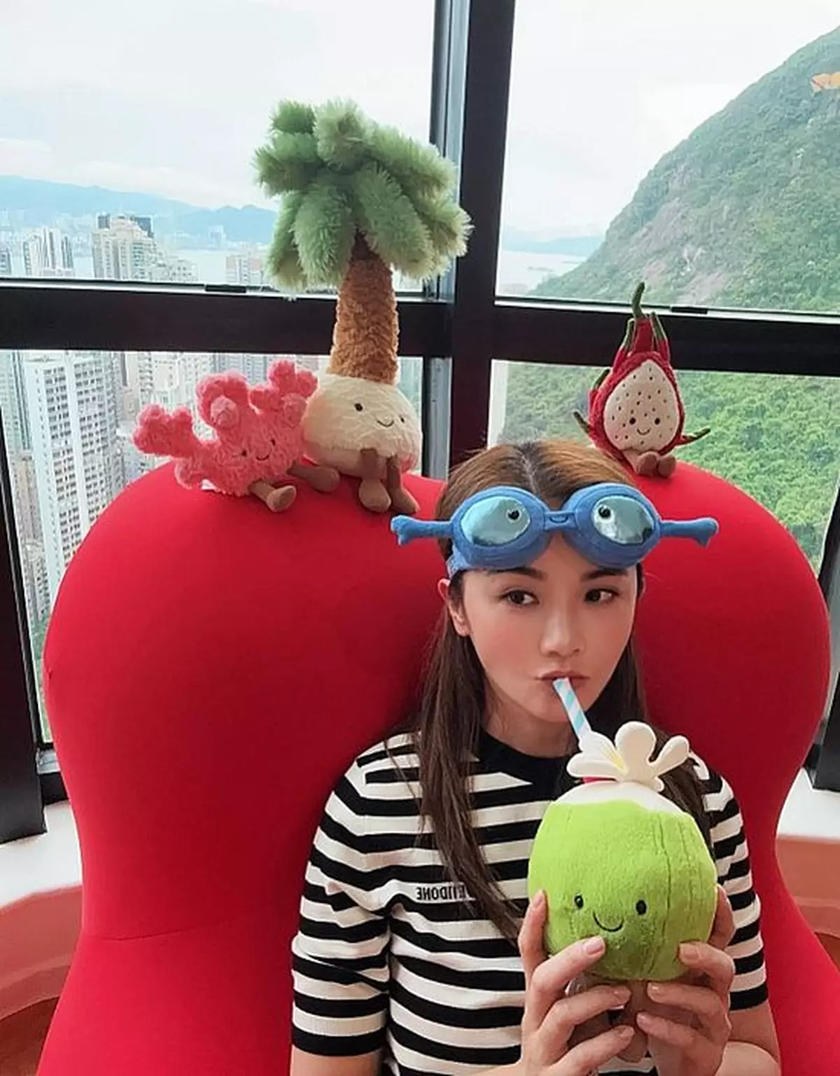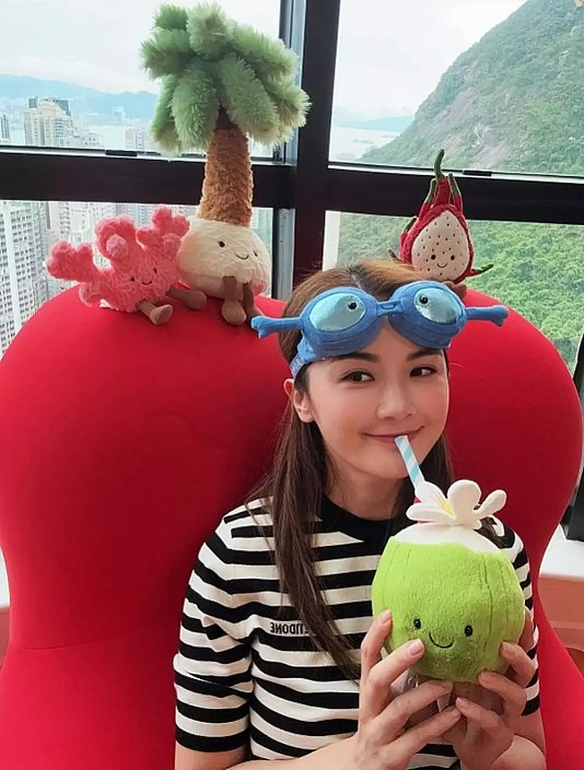阿Sa在落地玻璃前擺拍多張萌照,戴上Jellycat造型眼鏡、假裝飲用公仔椰子水,與各式軟萌公仔互動。她寫道:「Dive into summer with Jellycat!」盡顯俏皮本色,完全看不出已42歲。