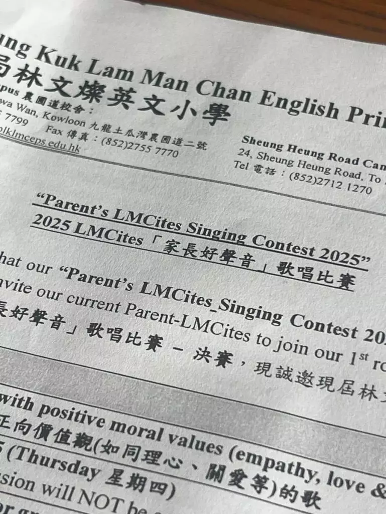 據網上瘋傳的相片可見,位於土瓜灣的著名直資學校保良局林文燦英文小學日前向全校家長發出通告,宣布校方將舉辦「家長好聲音」歌唱比賽,並誠邀校內應屆學生的家長積極參與。而選曲方面,校方就希望家長選取以正向價值觀、富有同理心、關愛訊息為主的歌曲。