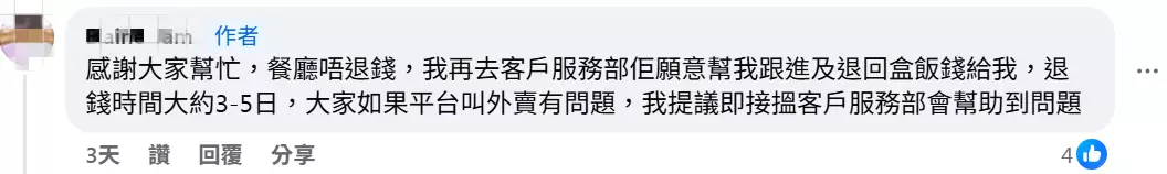 事主再留言,指外賣平台聯絡他,表示會再作跟進,或有機會退款:「感謝大家的幫忙,剛剛客戶服務部回覆我,話幫我跟進,大約3-5日時間,好開心。」