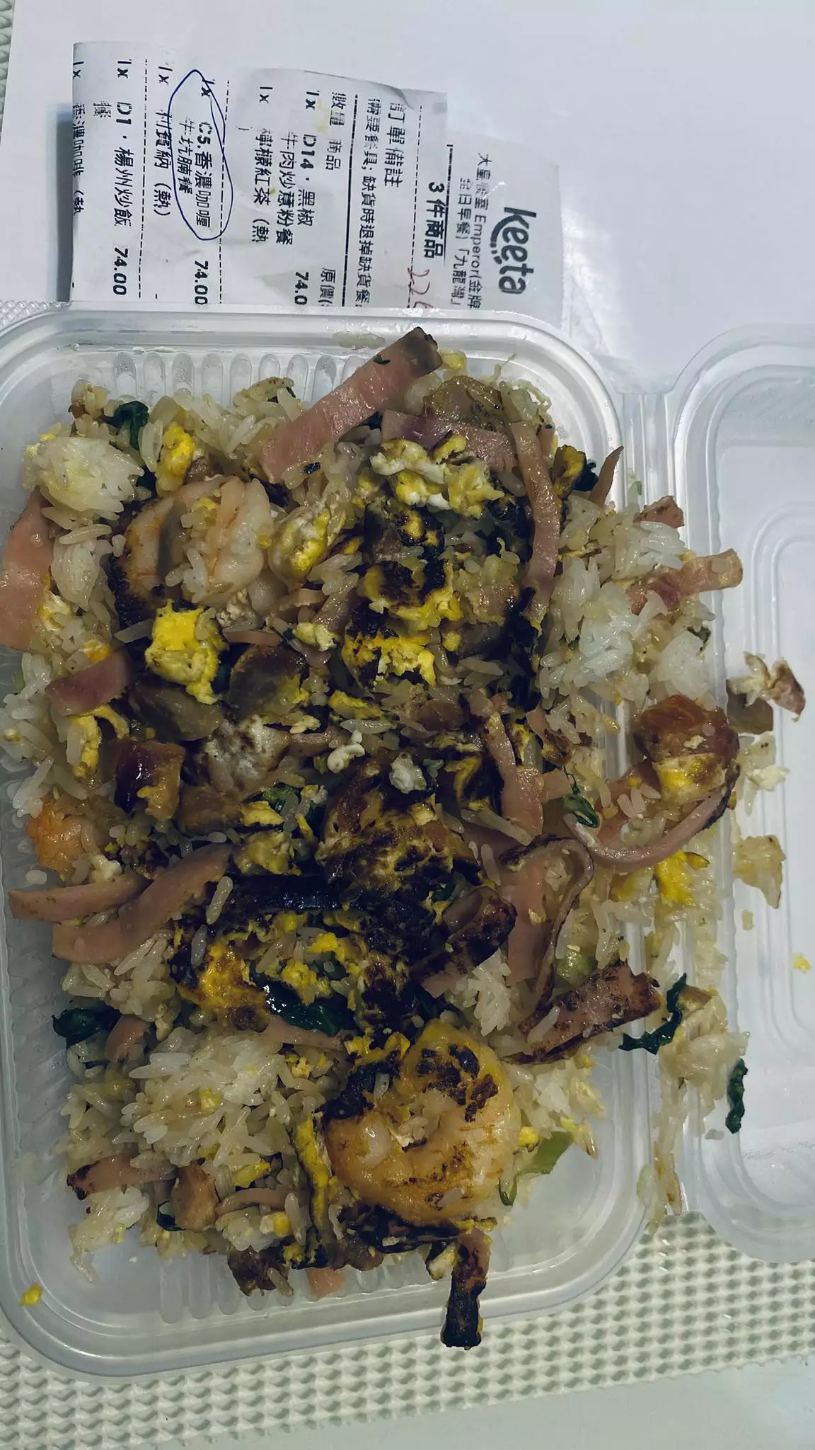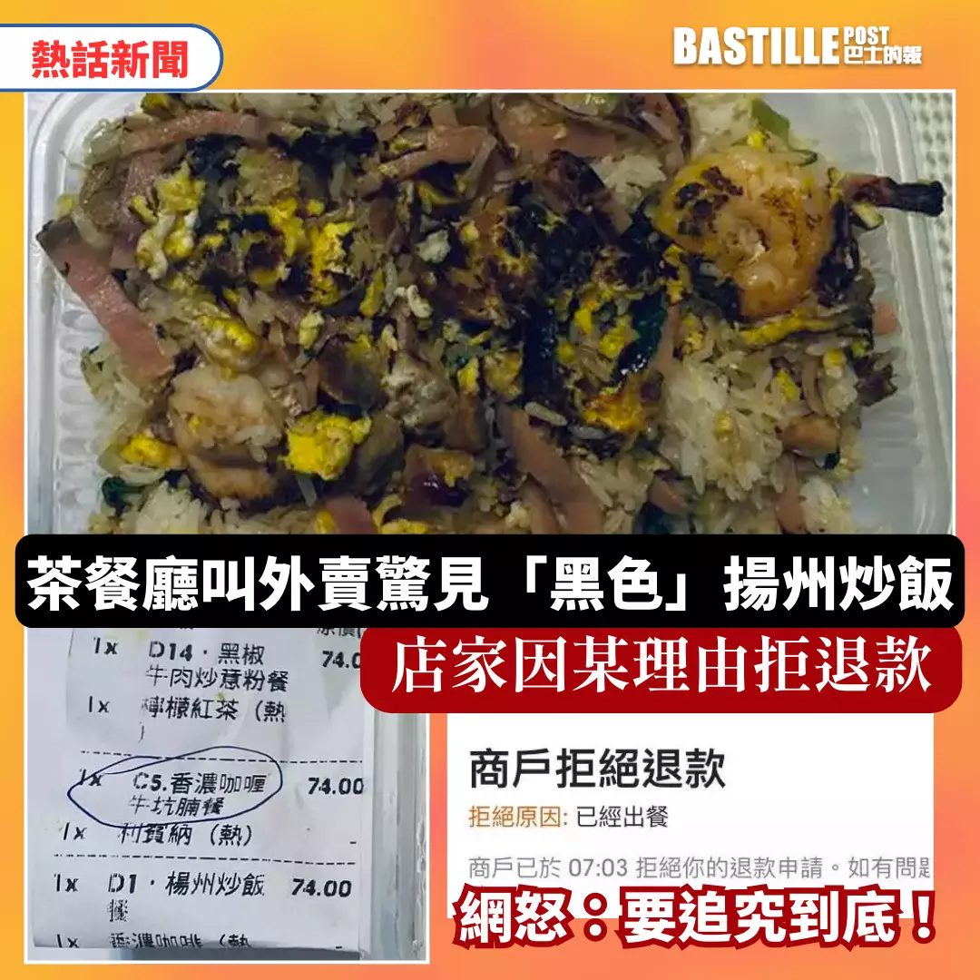 日前有網民透過外賣平台在九龍灣一間連鎖茶餐廳叫了一碟揚州炒飯,怎料送達時竟發現成盒飯炒到燶晒!事主不禁大驚「這間餐廳炒燶『黑色』的揚州炒飯!」