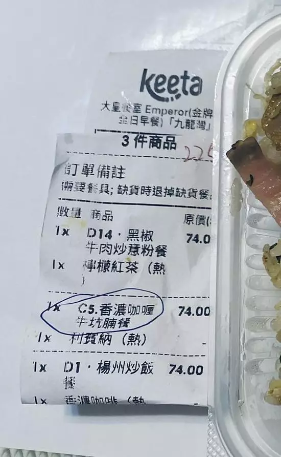 事主透過外賣平台,向涉事茶餐廳的九龍灣分店分別叫了3個餐,每餐售價74元。網上圖片