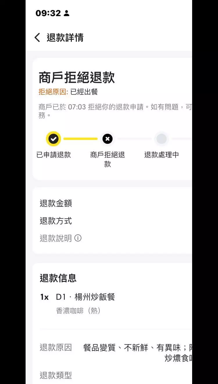 雖然事後他有透過平台聯絡涉事茶餐廳,向店家反映並要求退款,並在退款原因一欄寫到:餐品變質,不新鮮,有異味,炒燶等。但卻得到店家的拒絕,原因竟是「已經出餐」,並沒有就炒燶做出任何回應。