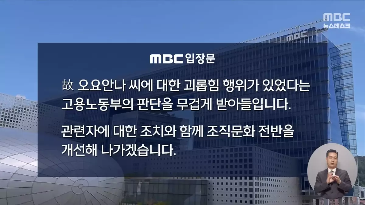 MBC電視台於5月19日透過《NEWS DESK》(新聞九點檔)節目公開道歉,聲明表示:「我們沉重地接受勞動部的調查結果,對於吳瑤安娜女士的不幸離世,向遺屬表達誠摯歉意。」MBC承諾制定防止職場霸凌再發的對策,改善組織文化,並設立新部門,確保自由工作者及非正職人員能透過當事人或第三方即時申訴問題。聲明強調,遵守勞動法規與改善職場環境將成為首要任務。