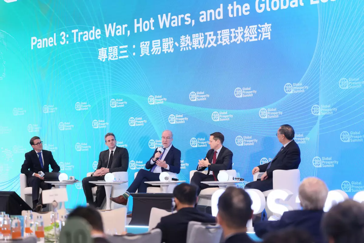 2025年全球繁榮峰會於5月20日舉行專題三:「貿易戰、熱戰及環球經濟」專題討論,香港歐洲商務協會主席亞瑪特主持會議,四位國際專家深入剖析當前國際經貿形勢。多位講者強調,中美貿易戰正重塑全球秩序,香港仍具不可替代的「超級聯繫人」功能,而中歐合作將成維護多邊體系關鍵力量。