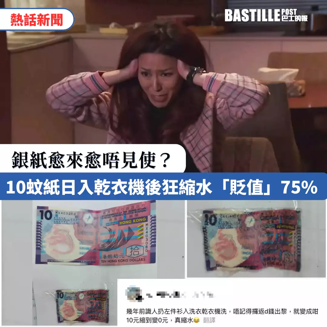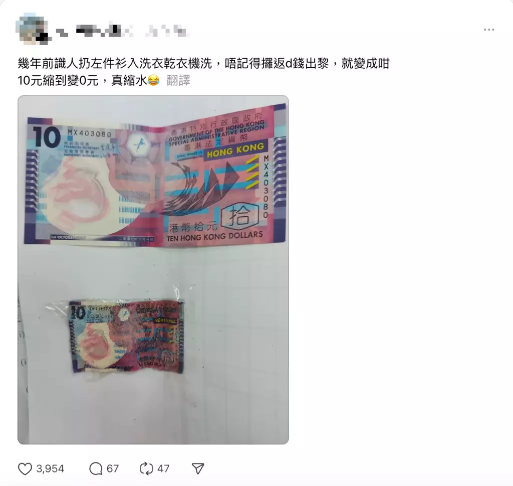近日就在社交平台Threads上分享自己遭遇的塑膠鈔票「貶值」事件,事主在網上分享「慘烈」對比照寫到,「幾年前識人扔咗件衫入洗衣乾衣機洗,唔記得攞返啲錢出嚟,就變成咁。10元縮到變0元,真縮水」。