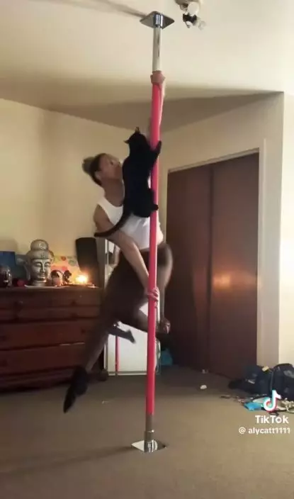 綜合外媒報導,美國一名女子愛莉(Ally)經常於家中跳鋼管舞,而家中飼養的黑貓「影子」(Shadow)則陪伴在側當「頭號觀眾」。沒想到,「影子」竟在潛移默化下也學會了幾招「舞蹈招式」,並趁愛莉練習時主動參與進去。