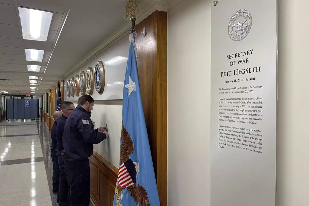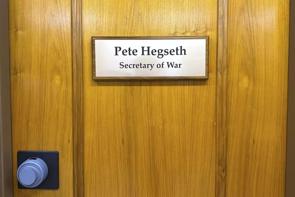 國防部長赫格塞思辦公室門牌改為戰爭部長銜頭。AP圖片