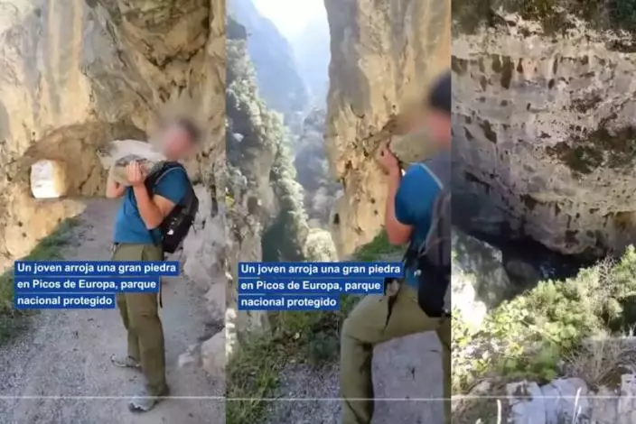 一男子近日前往西班牙旅遊,在參觀別稱為「歐洲之峰」的歐羅巴山國家公園(Picos de Europa)期間,被拍攝到隨意搬起一塊大石頭並將其扔下懸崖。對此,西班牙當局表示將追蹤這名男子。