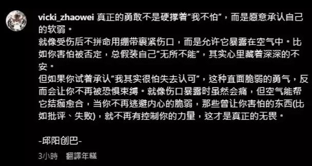 照片中,趙薇以黑白濾鏡示人,短髮造型俐落清爽,配文卻暗藏玄機。她引用佛教大師語錄,直言:「例如你害怕被否定,總假裝自己『無所不能』,其實心裏藏著深深的不安。但如果你試著承認『我其實很怕失去認可』,這種直面脆弱的勇氣,反而會讓你不再被恐懼束縛。」,更比喻傷口需要「暴露空氣中才能結痂」,被視為對輿論壓力的坦然回應。粉絲心疼留言:「薇姐這幾年真的辛苦了!」