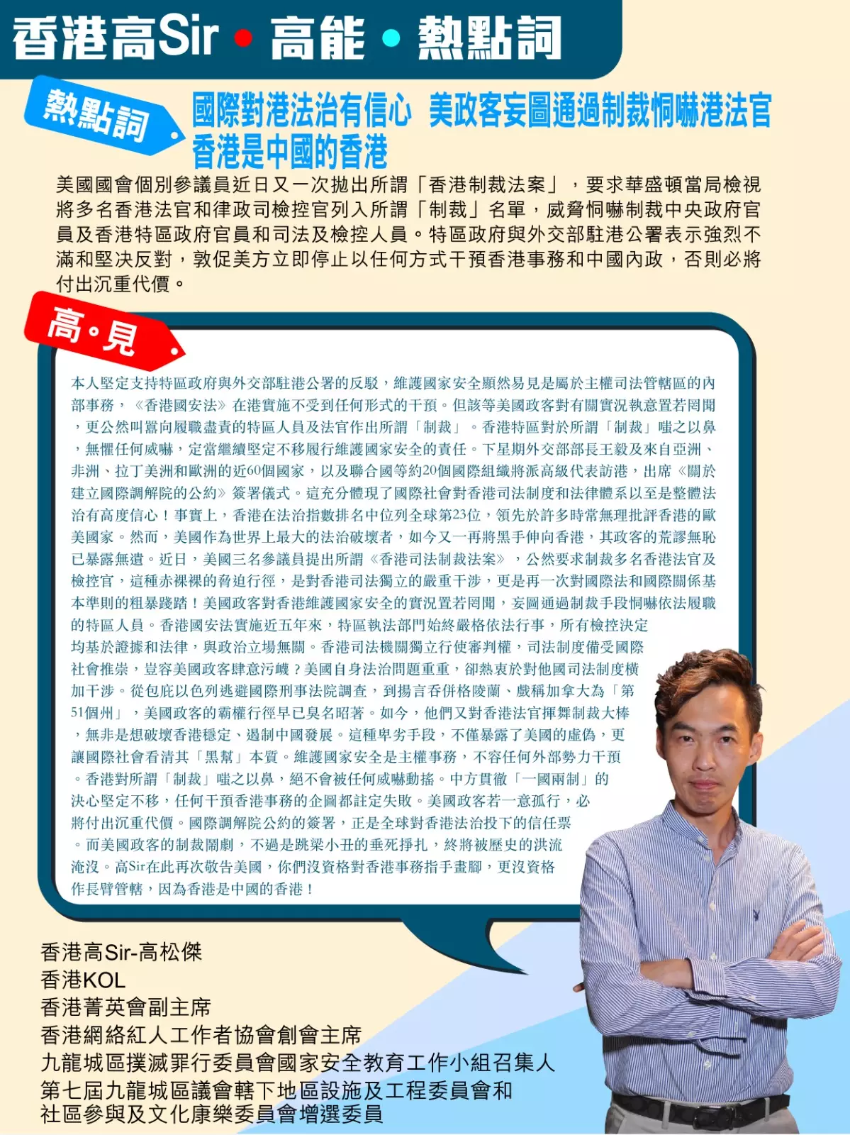高sir:本人堅定支持特區政府與外交部駐港公署的反駁,維護國家安全顯然易見是屬於主權司法管轄區的內部事務,《香港國安法》在港實施不受到任何形式的干預。但該等美國政客對有關實況執意置若罔聞,更公然叫囂向履職盡責的特區人員及法官作出所謂「制裁」。香港特區對於所謂「制裁」嗤之以鼻,無懼任何威嚇,定當繼續堅定不移履行維護國家安全的責任。下星期外交部部長王毅及來自亞洲、非洲、拉丁美洲和歐洲的近60個國家,以及聯合國等約20個國際組織將派高級代表訪港,出席《關於建立國際調解院的公約》簽署儀式。這充分體現了國際社會對香港司法制度和法律體系以至是整體法治有高度信心!事實上,香港在法治指數排名中位列全球第23位,領先於許多時常無理批評香港的歐美國家。然而,美國作為世界上最大的法治破壞者,如今又一再將黑手伸向香港,其政客的荒謬無恥已暴露無遺。近日,美國三名參議員提出所謂《香港司法制裁法案》,公然要求制裁多名香港法官及檢控官,這種赤裸裸的脅迫行徑,是對香港司法獨立的嚴重干涉,更是再一次對國際法和國際關係基本準則的粗暴踐踏!美國政客對香港維護國家安全的實況置若罔聞,妄圖通過制裁手段恫嚇依法履職的特區人員。香港國安法實施近五年來,特區執法部門始終嚴格依法行事,所有檢控決定均基於證據和法律,與政治立場無關。香港司法機關獨立行使審判權,司法制度備受國際社會推崇,豈容美國政客肆意污衊?美國自身法治問題重重,卻熱衷於對他國司法制度橫加干涉。從包庇以色列逃避國際刑事法院調查,到揚言吞併格陵蘭、戲稱加拿大為「第51個州」,美國政客的霸權行徑早已臭名昭著。如今,他們又對香港法官揮舞制裁大棒,無非是想破壞香港穩定、遏制中國發展。這種卑劣手段,不僅暴露了美國的虛偽,更讓國際社會看清其「黑幫」本質。維護國家安全是主權事務,不容任何外部勢力干預。香港對所謂「制裁」嗤之以鼻,絕不會被任何威嚇動搖。中方貫徹「一國兩制」的決心堅定不移,任何干預香港事務的企圖都註定失敗。美國政客若一意孤行,必將付出沉重代價。國際調解院公約的簽署,正是全球對香港法治投下的信任票。而美國政客的制裁鬧劇,不過是跳梁小丑的垂死掙扎,終將被歷史的洪流淹沒。高Sir在此再次敬告美國,你們沒資格對香港事務指手畫腳,更沒資格作長臂管轄,因為香港是中國的香港!