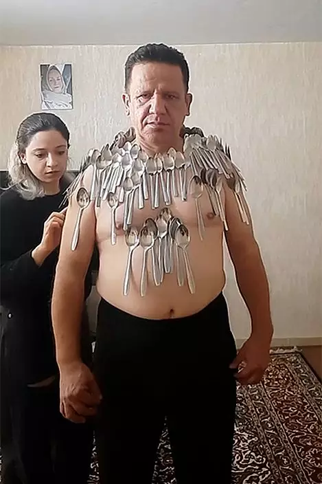 伊朗一名54歲男子成功黏附96支湯匙在身上,第3度打破健力士世界紀錄,展現其驚人的特殊技能。