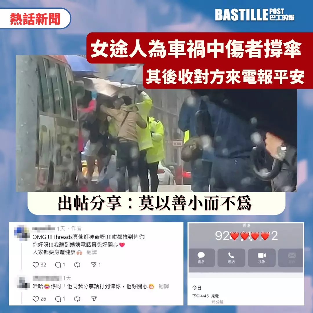 今年2月12日早上,紅磡差館里發生一宗車禍,當時一名年約60歲女子被紅色小巴撞倒,後腦流血。由於事發時正下大雨,有熱心市民為她撐傘直到救護車到達現場,將她送院治理。而其中一位有份撐傘的女子近日收到傷者的來電報平安及致謝,她開心發文至社交平台分享這份喜悅!