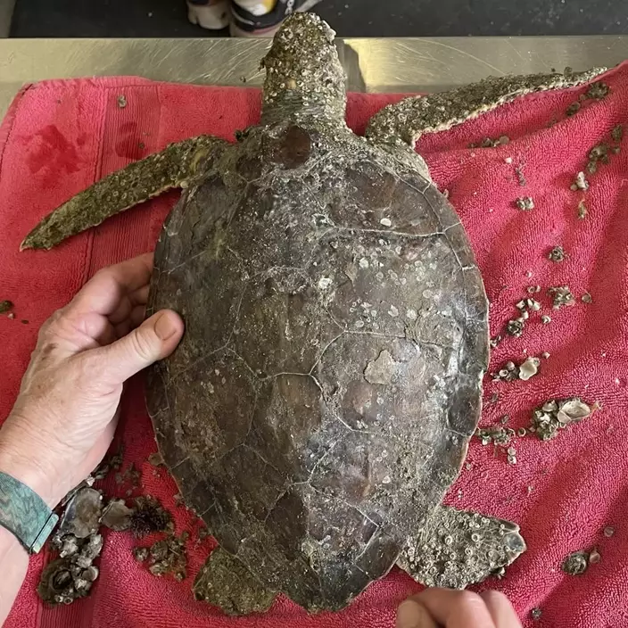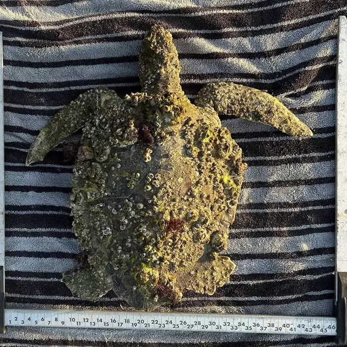 海岸資源管理團隊官方說明,這隻小綠蠵龜身上覆滿「附生生物」(epibiota),包括藤壺、藻類和其他海洋生物,經動物專家清理後,綠蠵龜體重從原本的3.4公斤減至2.8公斤。