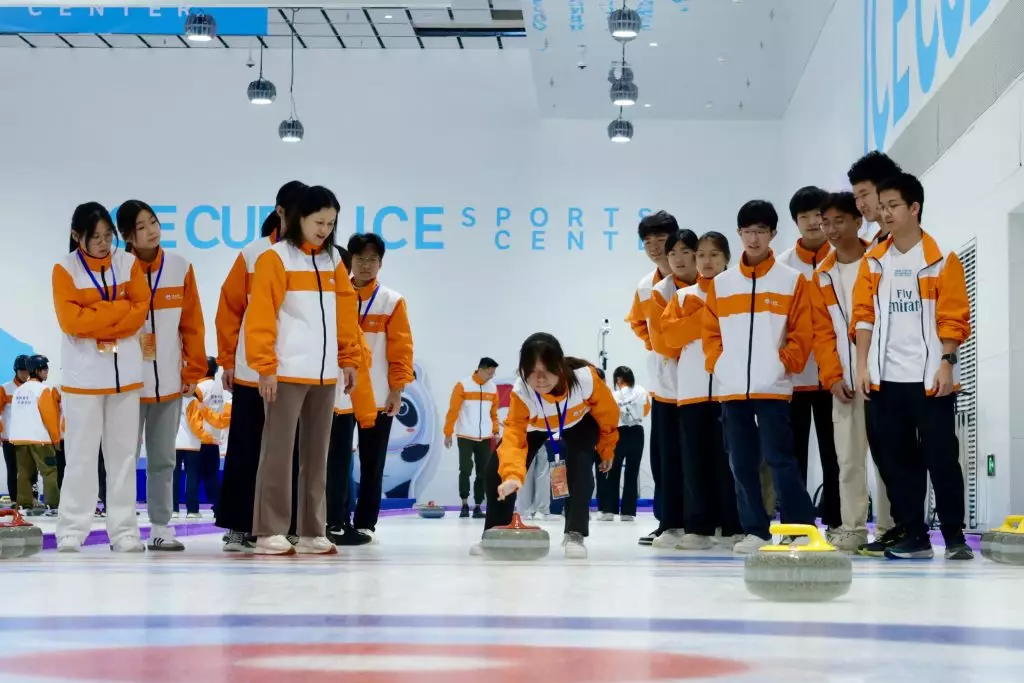 學生們與中國乒乓球奧運金牌得主丁寧切磋,從中學習技巧,現場氣氛熱烈。