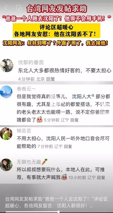 因為「不太會用手機,也不擅長使用社交軟件」,61歲的陳昭宏這趟獨自出遊讓在台灣的女兒倍感擔憂。不過,讓父女二人想不到的是,女兒網絡求助帖「爸爸一個人跑去瀋陽了!」引來瀋陽全城的暖心守護:擔心他找不到預訂的民宿,瀋陽網友貼出「精確到米」的交通指南;擔心他沒做好旅行攻略,網友在求助帖下接龍寫下「私藏」景點和美食精華;擔心他到北方不適應氣候,實時播報當天溫度,提醒加減衣服……4000餘條熱心回覆化作一份份暖心小貼士。