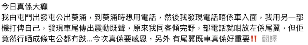 事主在Threads發文交代事件,指5月19日下午5時許由屯門出發,駛經屯門公路前往葵涌。抵達後欲使用iPhone時,才發現「電話唔喺車入面」,於是改用另一部手機致電尋找,結果聽到車尾傳出震動聲。