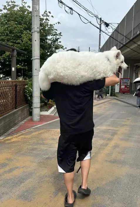 おさんぽ、疲れちゃって飼い主に担がれながら帰宅____ pic.twitter.com/kZ4JZ1KRo6</a ></p >— サモエド☆さだはる (@sadaharu__0905) May 16, 2025</a >