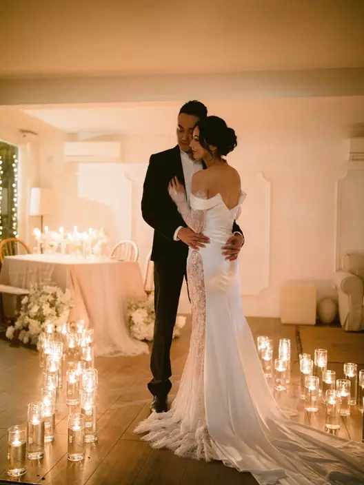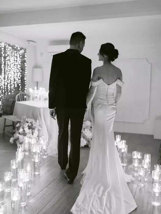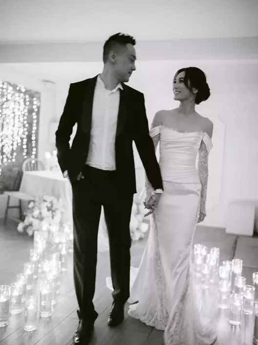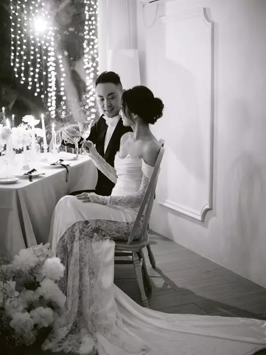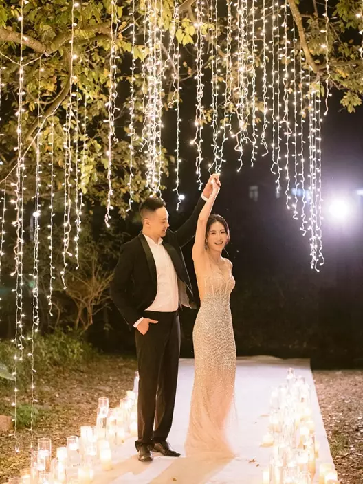 蔡嘉欣穿上胸貼身長拖尾婚紗。