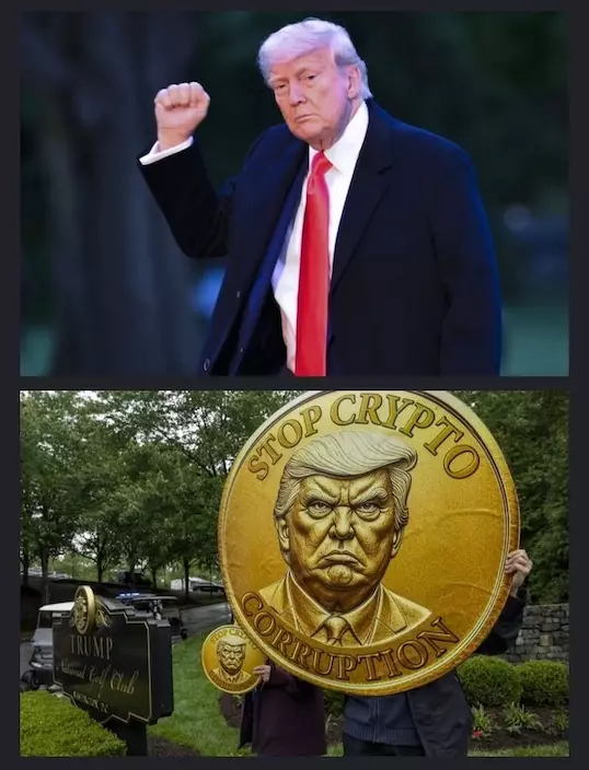 特朗普發行自己的加密幣「特朗普幣」,近日邀請220名「玩家」出席豪門夜宴,一晚吸金1.5億美元,被指是「貪腐盛會」(上圖),而他上台後即頻頻發功,為家族開路在加密幣市場謀暴利。大批群衆在場外高舉「停止加密幣貪汚」的標語(下圖)。