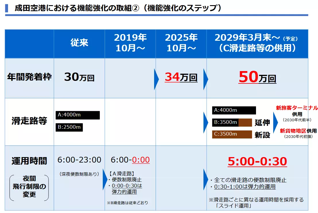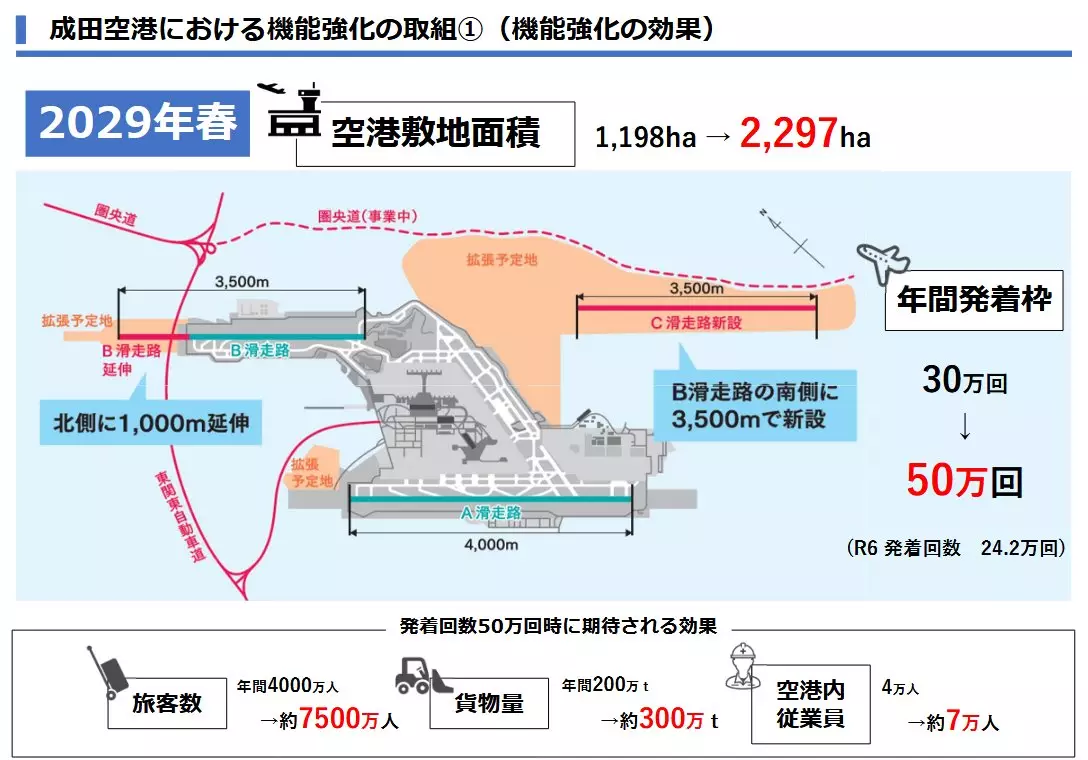 日本成田國際機場公司爭取擴建和新建成的跑道在2029年3月底投入使用,以應付日益增加的航空需求。