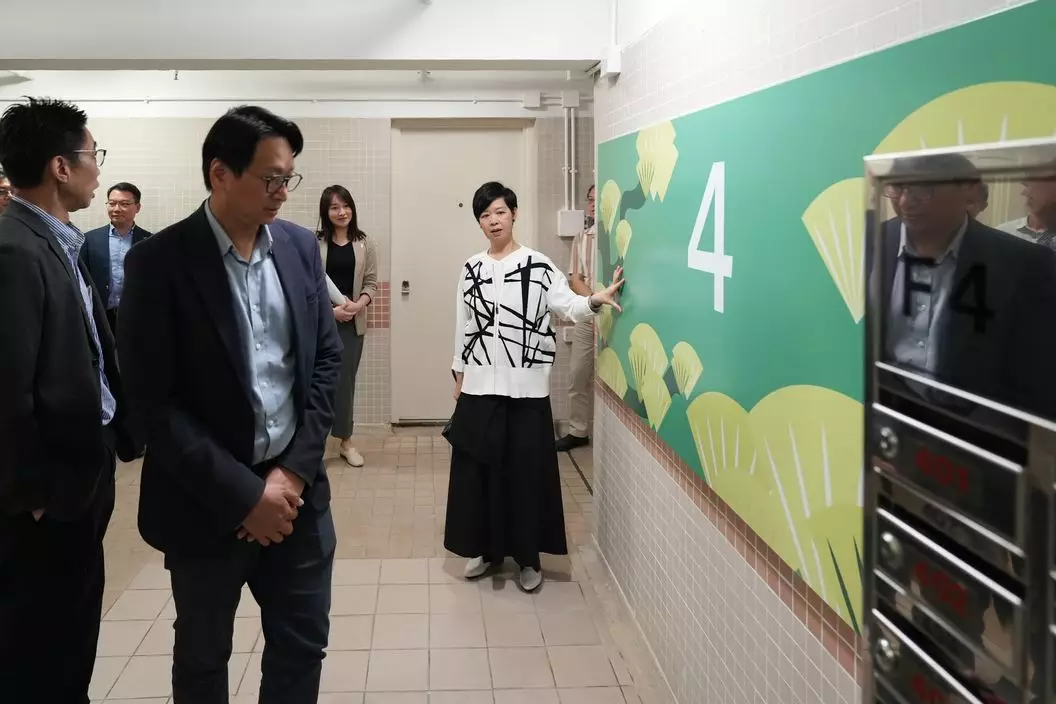當日何永賢一行人還視察了雲漢邨的美化成果。見到往日稍欠活力的屋邨,各自按漢松樓、漢柏樓的名字畫上松柏圖案,為屋邨加添了一抺柔和色彩,並將往日重門深鎖的邨口大閘,更換成矮閘並加添植物,令邨口有防護的同時,看上去多了分恬靜愜意。住宅地下大堂還增設社區座椅和可暫放拐杖的扶手,方便長者等候電梯時可以稍作休息。何永賢希望不論是屋邨美化工作或科技應用,都可以傳遞到以人為本的精神,為住戶帶來更多幸福感。