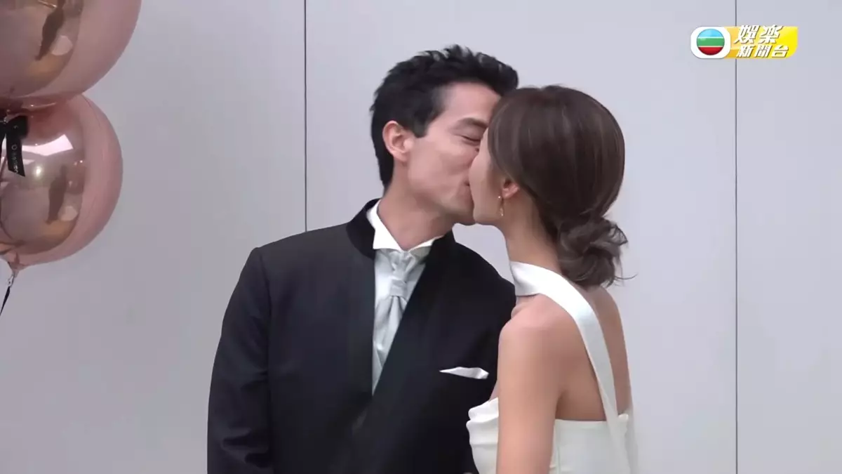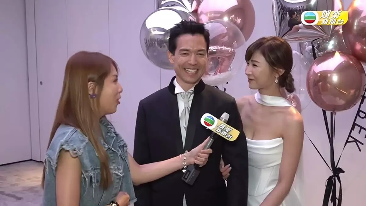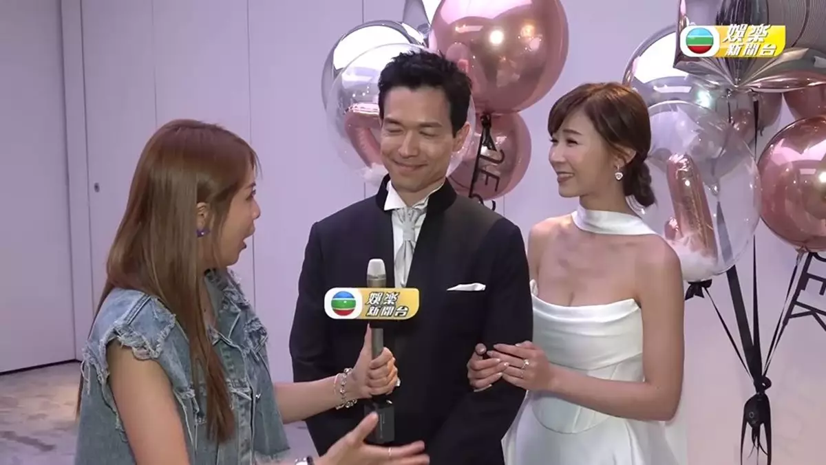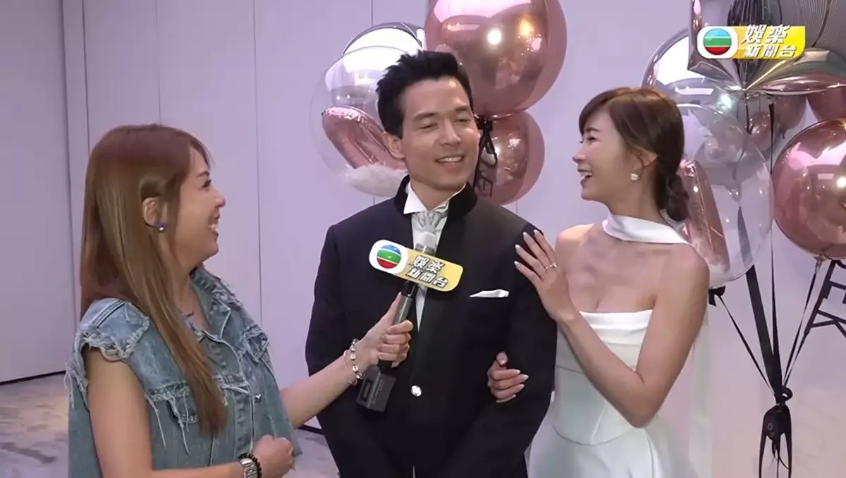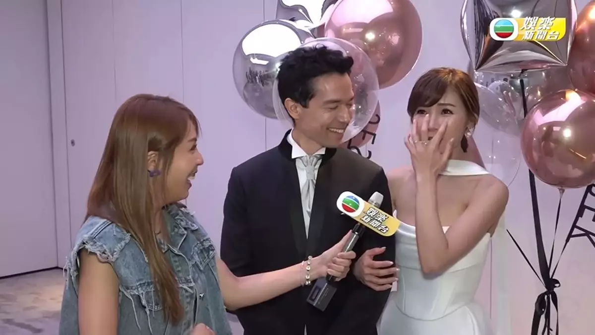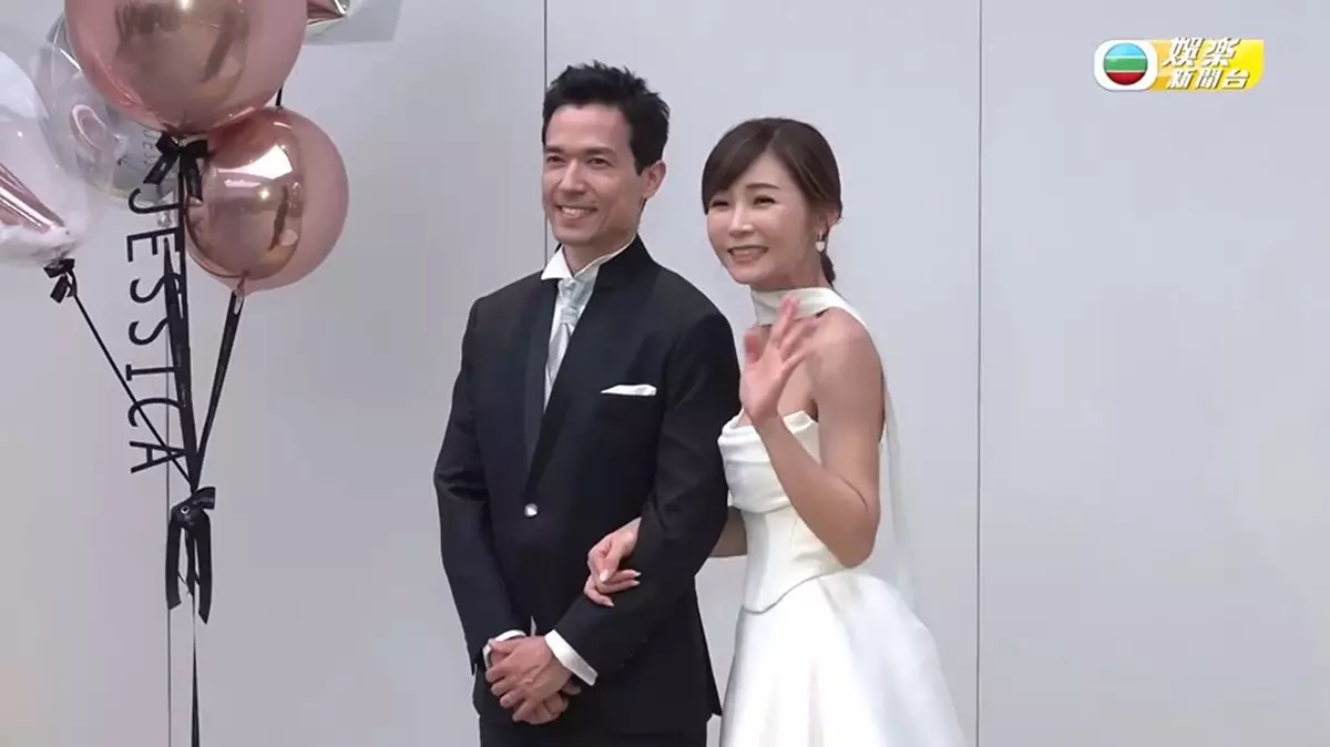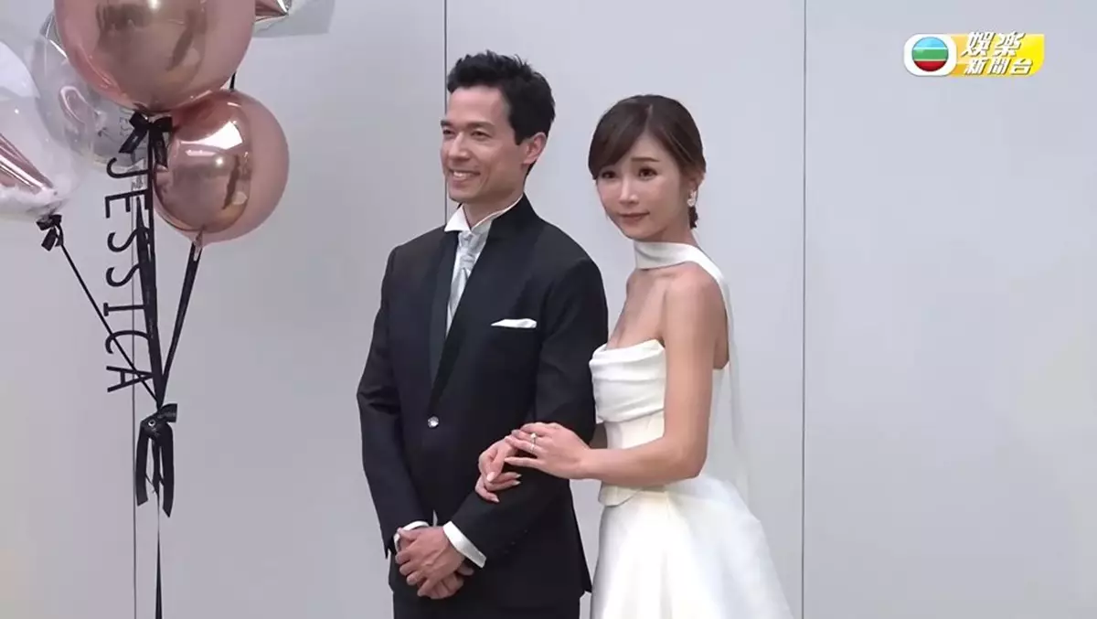 新娘子Jessica穿上純白露肩晚裝,左手戴上婚戒及近3卡求婚戒指,接受訪問時坦言舉行婚禮有點累,因為有好多程序上事要處理,但新郎Derek就指有老婆處理所有事,所以自己完全不累。Jessica解釋因為老公慫恿,所以她才獨攬籌備婚,指Derek話一個人負責先才不會有拗撬,又爆老公不參加備婚,但都會有意見,導致有頂撞出現,而且不會先低頭,笑言:「始終機師都有佢嘅堅持。」