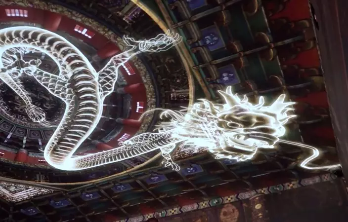 觀眾可欣賞藻井裝飾,以及栩栩如生的飛龍投射。巴士的報記者攝