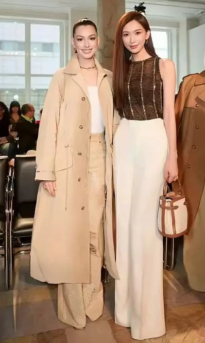 林志玲當天以一襲深棕色透視串珠背心搭配米白色長褲現身,長髮披肩,盡顯高貴典雅氣質。Anne Hathaway則綁起高馬尾,穿著米色風衣搭配白色上衣和亮片破洞牛仔褲,兩人站在一起時尚感十足,氣場互相輝映。雖然Anne Hathaway比林志玲年輕8歲,但兩人同框時完全看不出年齡差距,網友紛紛驚嘆「逆齡神顏」、「站在一起根本是雙女神」。