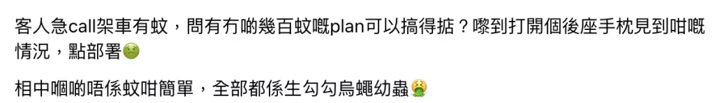 事緣一名車主發現車內出現蚊蟲,急召汽車美容公司提供清潔服務。當技師打開後座手枕儲物格時,赫然發現內裡藏有一個發霉飯糰,包裝袋內外爬滿活生生的蒼蠅幼蟲,場面令人作嘔。公司負責人無奈表示,原本以為只是普通蚊蟲問題,沒想到竟是嚴重的蛆蟲滋生情況。