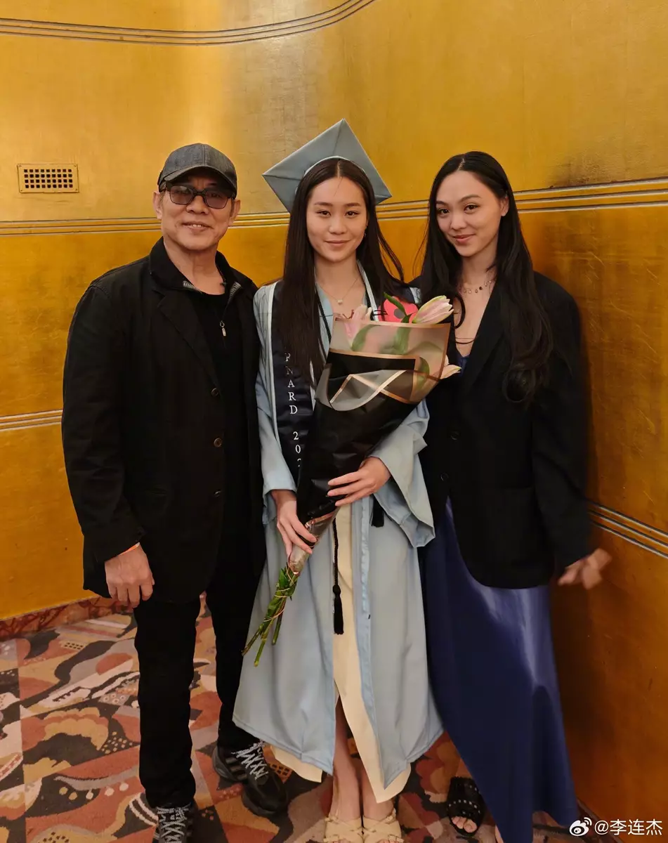 李連杰與前妻黃秋燕、現任妻子利智所生的四名女兒均畢業自美國頂尖學府:二女兒成為執業眼科醫師、三女兒Jane李安迪畢業於哈佛大學,如今小女兒Jada再為家族添上哥倫比亞大學光環。畢業典禮上,李連杰精神奕奕與女兒們合影,父愛滿溢。