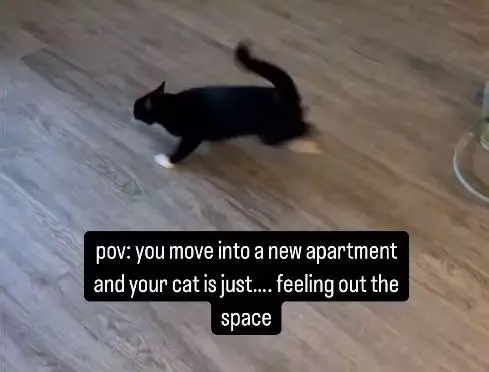 影片可見,尼寇從臥室飛速衝入尚未佈置完成的客房,在空地上完成「帥氣甩尾」後,直奔陽台準備一躍而下,結果瞬間掛在防護網上,宛如一隻「蜘蛛貓」,場面相當滑稽。安娜邊笑邊出聲阻止,「不行,快下來!」但尼寇似乎意識到自己的失態,若無其事跑回臥室喝水,假裝什麼事都沒發生過。