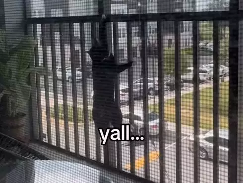 賓士貓搬新家太興奮到處亂竄,飛速衝向窗台計劃「恢復自由身」,結果牢牢掛在防護網上笑翻眾人。