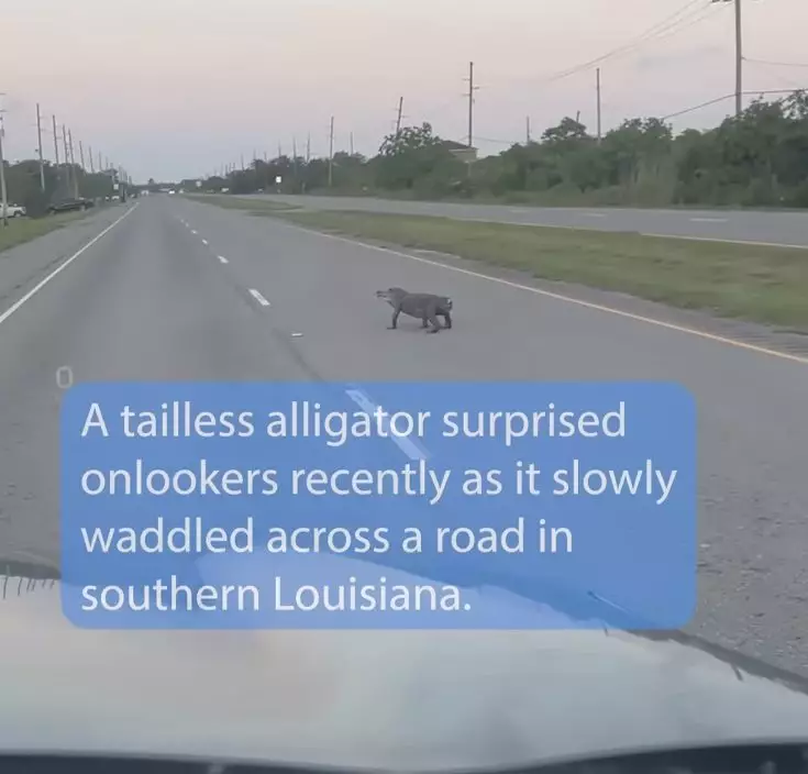 綜合外媒報導,美國路易斯安那州南部普拉克明郡(Plaquemines Parish)5月20日傍晚上演一幕奇景。當天,一名居民許琳·巴多羅買(Ashlyn Bartholomew)駕車載孩子從棒球練習場返家途中,驚見一隻「龐然大物」橫穿馬路。起初,她誤以為是迷路的法國鬥牛犬,駛近細看才發現是一隻失去尾巴的「短吻鱷」,巴多羅買對此極為驚訝,隨即在Facebook發文提醒,「大家小心,有半截鱷魚在路上走!」
