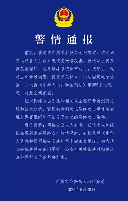 廣州市公安局天河區分局本月20日發出警情通報稱,廣州某科技公司遭境外黑客組織網絡攻擊,公安機關立即組織專業技術團隊開展技術溯源。