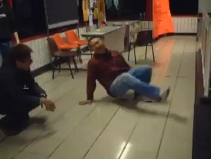 Bob身穿白色T恤,在大學走廊及課室內大跳Freestyle。