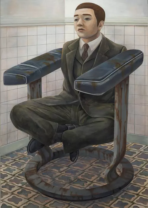《空置大廈內的經理座位》堪稱石田徹也最具標誌性的創作之一,作品呈現一位身著西裝的經理人物,以盤腿姿態化身為一張破舊不堪的辦公椅,雙臂與金屬椅架以詭異的方式融合,空洞的眼神與麻木的表情,深刻象徵著階級社會中個人的渺小與無助。