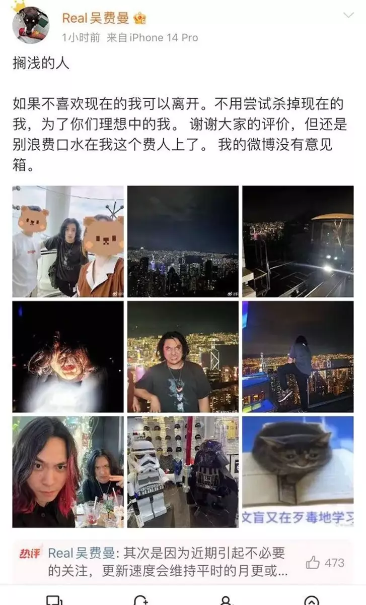 該名幸運網民在社交平台興奮分享:「在灣仔地鐵站一抬頭就看到了小時候電視上看到的人!」照片中費曼低頭玩手機,雖未露正臉,但招牌慵懶氣質依舊。部分網友留言讚其「少年感十足」,卻也有人毒舌批評身材與造型。對此,費曼日前在微博以「擱淺的人」為題發文,直接開嗆:「如果不喜歡現在的我可以離開。不用嘗試殺掉現在的我,為了你們理想中的我。」更幽默自嘲:「謝謝大家的評價,但還是別浪費口水在我這個廢人上了。我的微博沒有意見箱。」霸氣回應被粉絲狂讚「果然遺傳老爸的硬核基因!」