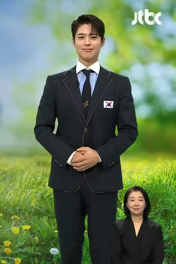 朴寶劍日前驚喜現身JTBC天氣新聞報道。 THE BLACK LABEL twitter圖片