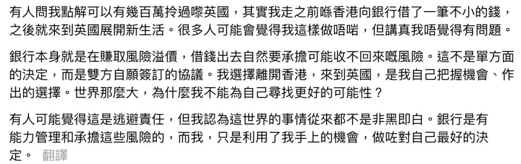 事主透露,數百萬借款並未用於置業,而是「玩下輪都夠做」,包括投資美股、定期存款甚至賭場消費。他更炫耀移英後的生活:「有工就返下,得閒踢波行山」,聲稱首年已遊遍歐洲多國,更揶揄「幾百萬喺香港做唔到啲乜」。