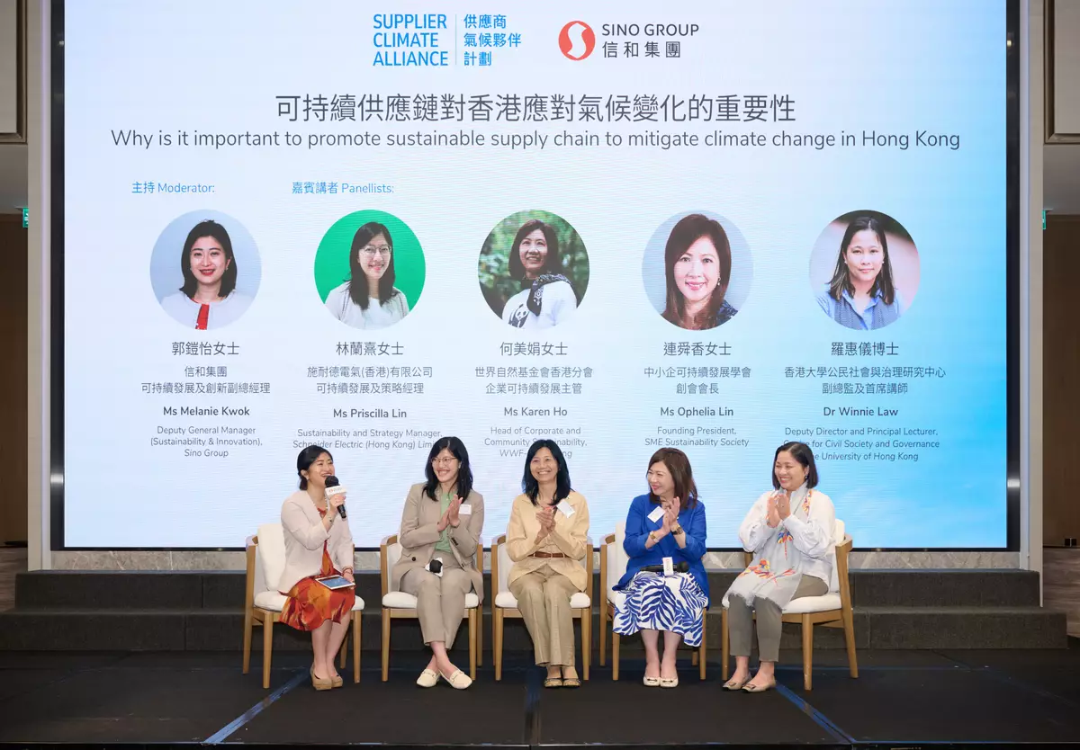 《供應商氣候夥伴計劃》的首場座談會由信和集團可持續發展及創新副總經理郭鎧怡女士(左一)主持,邀請了香港大學公民社會與治理研究中心副總監及首席講師羅惠儀博士(右一)、中小企可持續發展學會創會會長連舜香女士(右二)、世界自然基金會香港分會企業可持續發展主管何美娟女士(圖中)、施耐德電氣(香港)有限公司可持續發展及策略經理林蘭熹女士(左二),探討可持續供應鏈對香港應對氣候變化的重要性。