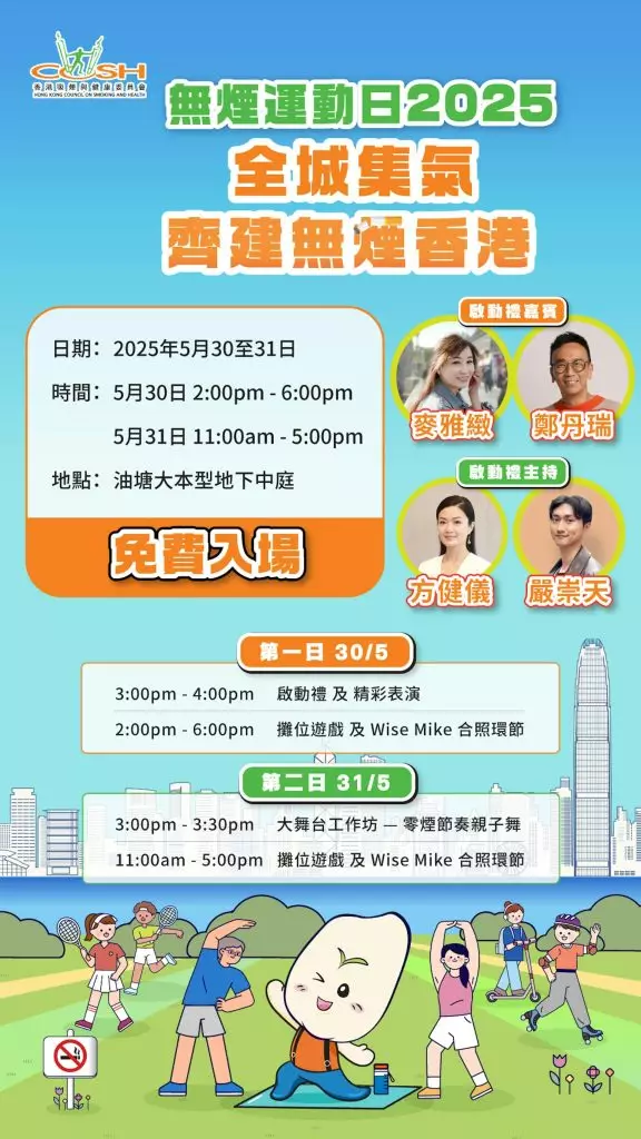 為響應5月31日世界無煙日,香港吸煙與健康委員會今年以「全城集氣.齊建無煙香港」為主題,舉辦宣傳活動,並將於5月30至31日在油塘大本型中庭舉行無煙運動日啟動禮暨嘉年華,市民可免費參加。