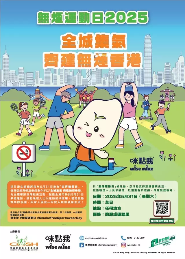 香港吸煙與健康委員會邀請全港市民於5月31日響應穿跑服或運動服及多做運動,藉此推動公眾人士共同宣揚無煙信息,鼓勵吸煙人士以運動戒掉煙癮,營造鼓勵戒煙的氛圍,爭取更多公眾支持《2025年控煙法例(修訂)條例草案》,並期望立法會儘快完成審議,落實加強控煙措施,與家人朋友一同投入無煙健康生活,邁向無煙香港。