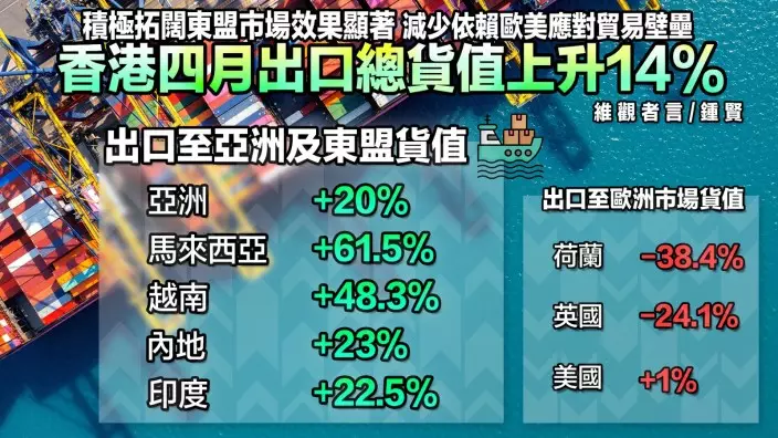 儘管美國的關稅政策對部分出口商造成衝擊,但香港的經濟結構已逐漸轉向高附加值服務業,例如金融、物流和專業服務,這些行業受關稅影響較小。此外,政府近年積極拓展東盟新興市場,特首李家超多次率團到訪中東、東盟及一帶一路國家,成功為香港打開新興市場。4月,政府統計處數據顯示,香港整體出口按年上升14.7%,當中出口至亞洲及東盟國家錄得顯着升幅,對整個亞洲增長20%、對馬來西亞上升61.5%、越南上升48.3%、內地市場上升23%,而印度亦上升22.5%;同時,香港亦減少對歐美市場的依賴,對荷蘭出口下跌38.4%、英國下跌24.1%、美國僅微升1%,充分反映香港高瞻遠矚,成功開拓新興市場,以應對歐美貿易壁壘及經濟不穩定因素。
