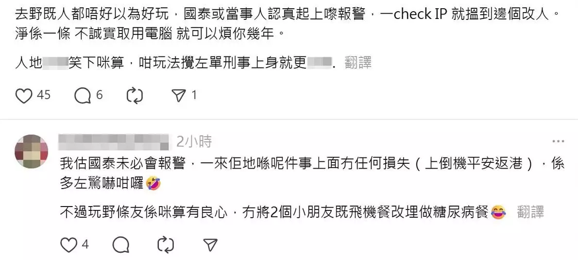 事件引來網民的熱議,不少人都覺得此名港爸已得到很大教訓「貼哂名出黎,唔俾人玩到即場取消機票執到啦」、「冇比人cancel(取消航班)真係好好彩」、「佢算好彩,只係分開坐,呢d(啲)同國泰講返應該可以坐返一齊,希望佢學識呢次教訓。」不過,亦有人認為背後黑手隨時會惹上官非,「唔好以為好玩,國泰或當事人認真起上嚟報警,一check IP就搵到邊個改人。」