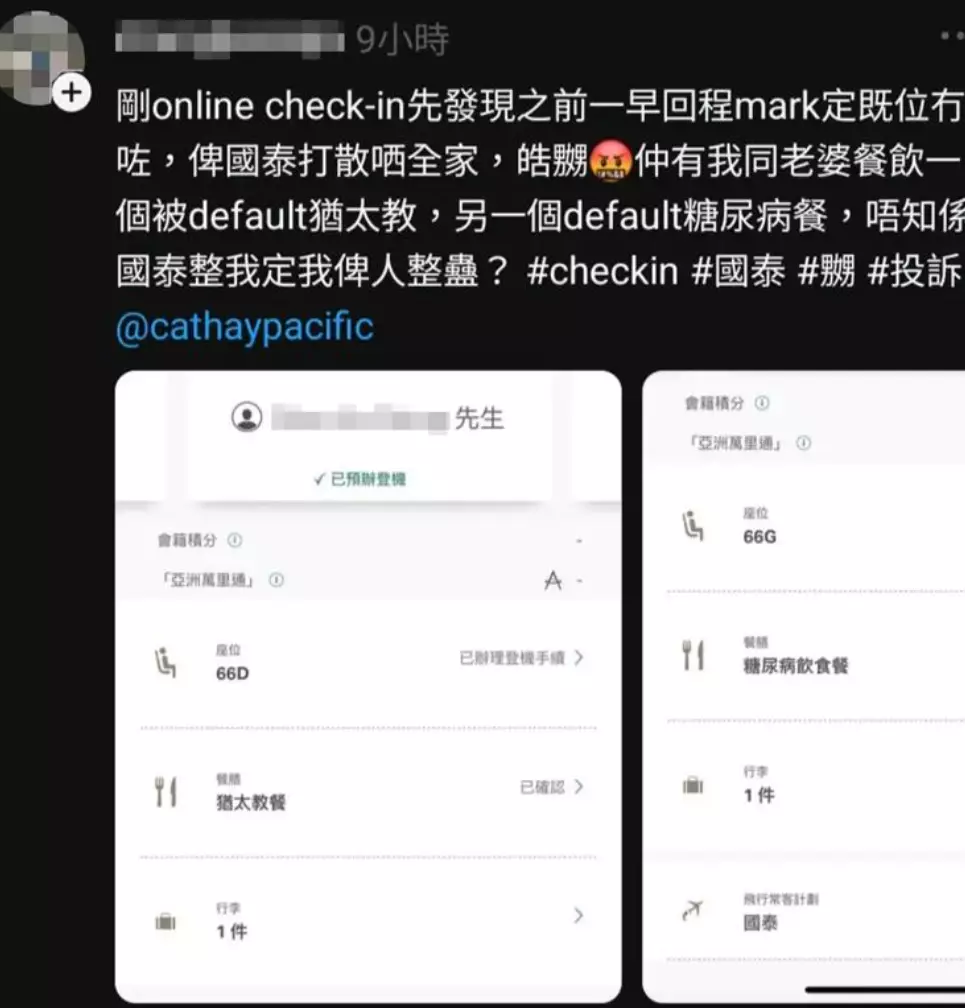 這位港爸在社交平台發文嬲爆寫道「剛online check-in先發現之前一早回程mark 定既位冇咗,俾國泰打散哂全家....仲有我同老波餐飲一個被default猶太教,另一個default糖尿病餐」他大呻到「唔知係國泰整我定我俾人整蠱?」更在文末附上「國泰」、「嬲」和「投訴」的標籤。