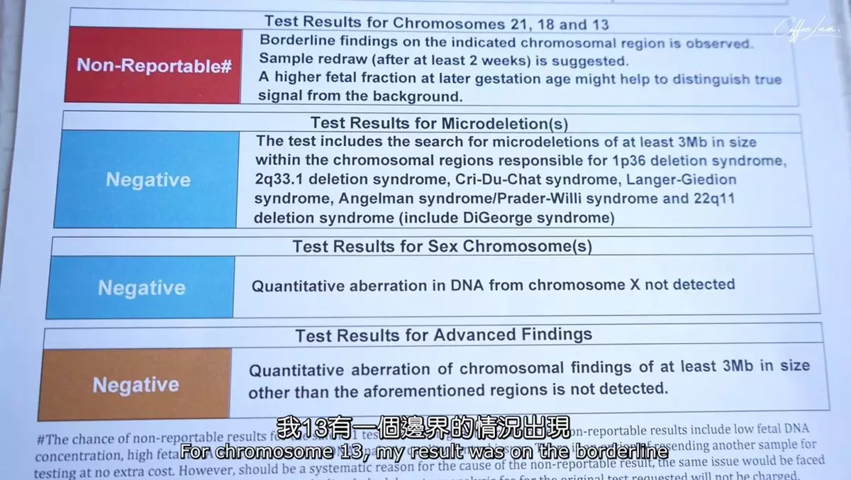 不過,最嚴重的是胎兒的驗血報告顯示對「13號染色體異常」(帕陶氏症)有「擲界」情況,最壞情況可能會有心臟缺陷、腦部發育異常、智力不足、兔唇、6隻手指或腳趾等,更有機會活不到一歲,於是在醫生建議下,Coffee再到兩間化驗中心做驗血測試,現在仍等待結果,醫生亦一直安慰她,表示有很多原因導致檢查出染色體有問,但Coffee仍按捺不住情緒,邊講邊喊說:「呢個等待時間係好恐怖嘅...不過呢....我又...我知道呢個問題後一直表現得好堅強,我一直覺得,如果有問題咁就...」加上報告延遲出結果,令Coffee更加胡思亂想。