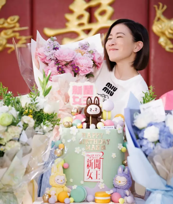 從相片所見,現場以粉紫色及銀色氣球佈置,洋溢歡樂氛圍。佘詩曼身穿簡約T恤,手捧大束粉紫色鮮花,面露幸福笑容。生日蛋糕造型搶眼,以人氣公仔Labubu為主題,毛茸茸的兔耳與呆萌表情極具童趣,蛋糕上更寫有「HAPPY BIRTHDAY MAN姐」及「新聞女王」字樣,呼應劇集角色,誠意十足。現場還有多個精緻蛋糕和花束,佘詩曼被「花海」包圍,盡顯主角光環。