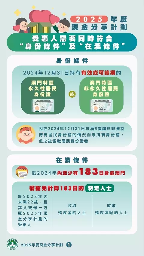按照澳門行政法規的規定,澳門居民在同時符合身份條件及在澳條件的情況下,可獲發現金分享,永久性居民每人一萬澳門元,非永久性居民每人六千澳門元。身份條件是指在2024年12月31日持有有效或可續期的居民身份證,這一點與過往制度相同;在澳條件是指在2024年全年身處澳門至少183日,這一點是法規新設的條件。